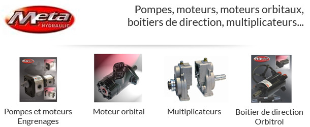 Meta Hydraulic est une société Italienne, fondée en 1989, basée à côté de Modena. Spécialisée dans la fabrication de composants hydrauliques, META offre une gamme complète de moteurs orbitaux (licence SAUER DANFOSS), pompes à engrenages, multiplicateurs de vitesse pour tracteur (applications type fendeuses), système de direction…
